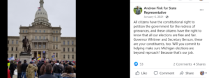 Facebook post by state Rep. Andrew Fink (R-Hillsdale) from the Michigan Capitol on Jan. 6, 2021 | Screenshot