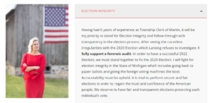 SD-17: On his campaign website, Trump-endorsed candidate Jonathan Lindsey claims the 2020 election “was not conducted legally, was “open to manipulation and fraud” and “resulted in many reports of irregularities.” He also slams Michigan GOP legislators for “refus[ing] to fulfill their constitutional duty when faced with election results tainted by illegality,” while in fact Michigan’s state Legislature did not have the legal ability to overturn the state’s election results.