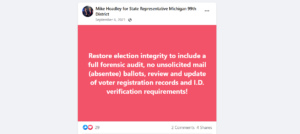 HD-99: Trump-endorsed Mike Hoadley has made several overtures on social media indicating that he does not trust the results of the 2020 election, including a call to “restore election integrity to include a full forensic audit.” His campaign platform also demands that “ballots are counted only by methods or machines that are resistant to tampering,” which echoes baseless right-wing conspiracies that Democrats tampered with voting machines to change votes in favor of Biden.